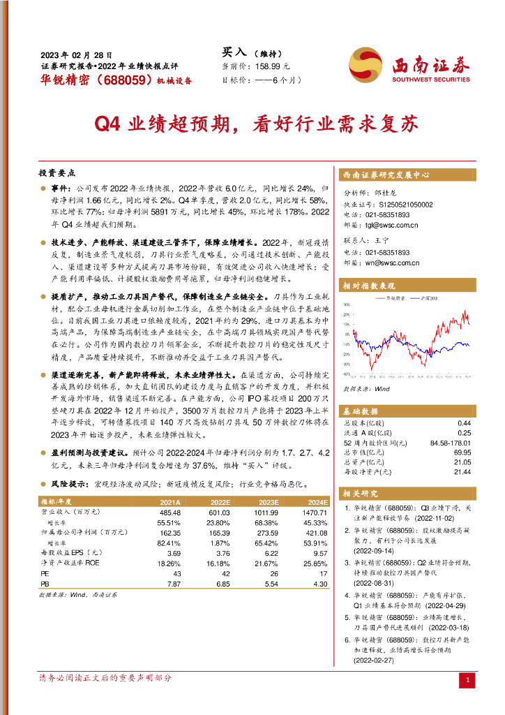 西南证券:华锐精密(688059)-Q4业绩超预期,看好行业需求复苏.pdf