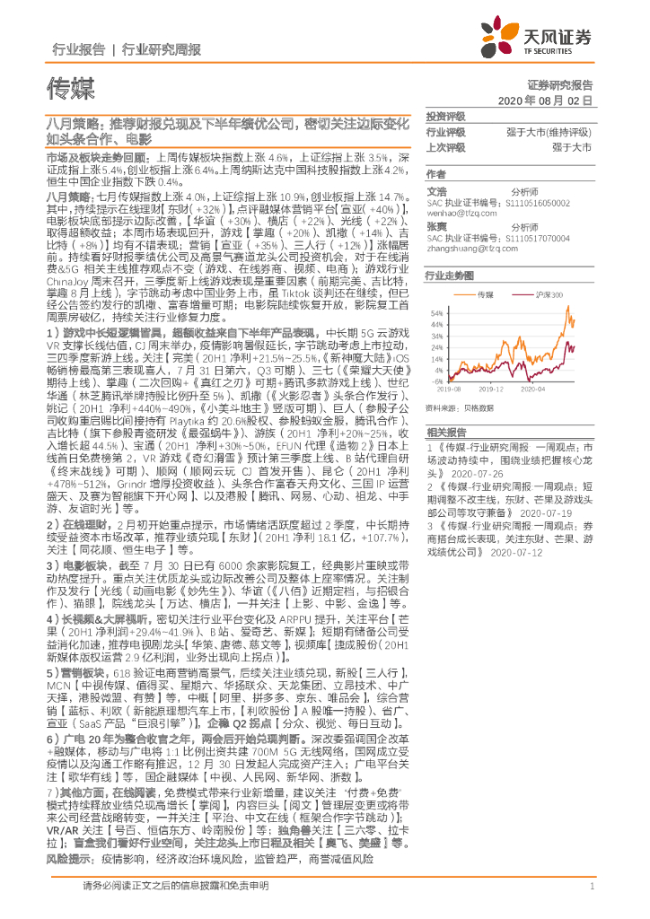 天风证券:传媒八月策略:推荐财报兑现及下半年绩优公司,密切关注边际变化如头条合作、电影.pdf