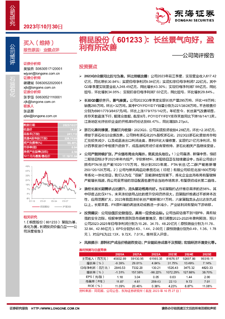 东海证券:桐昆股份(601233)-公司简评报告:长丝景气向好,盈利有所改善.pdf