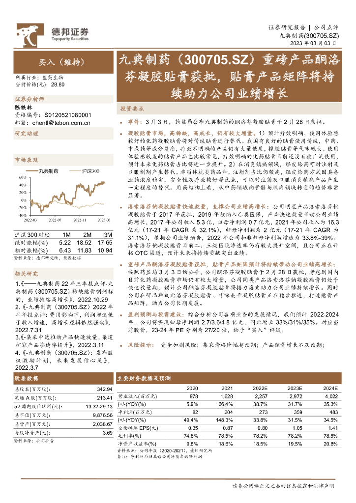 德邦证券:九典制药(300705)-重磅产品酮洛芬凝胶贴膏获批,贴膏产品矩阵将持续助力公司业绩增长.pdf