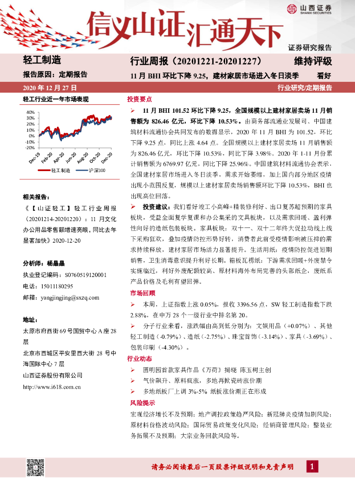山西证券:轻工制造行业周报:11月BHI环比下降9.25,建材家居市场进入冬日淡季.pdf