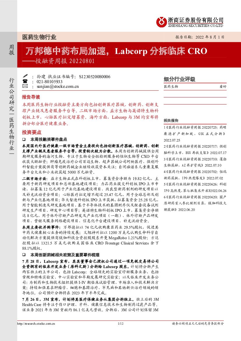 浙商证券:医药生物行业投融资周报:万邦德中药布局加速,Labcorp分拆临床CRO.pdf