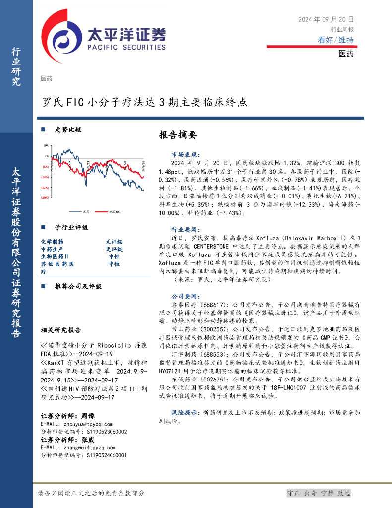 太平洋证券:医药行业周报:罗氏FIC小分子疗法达3期主要临床终点.pdf