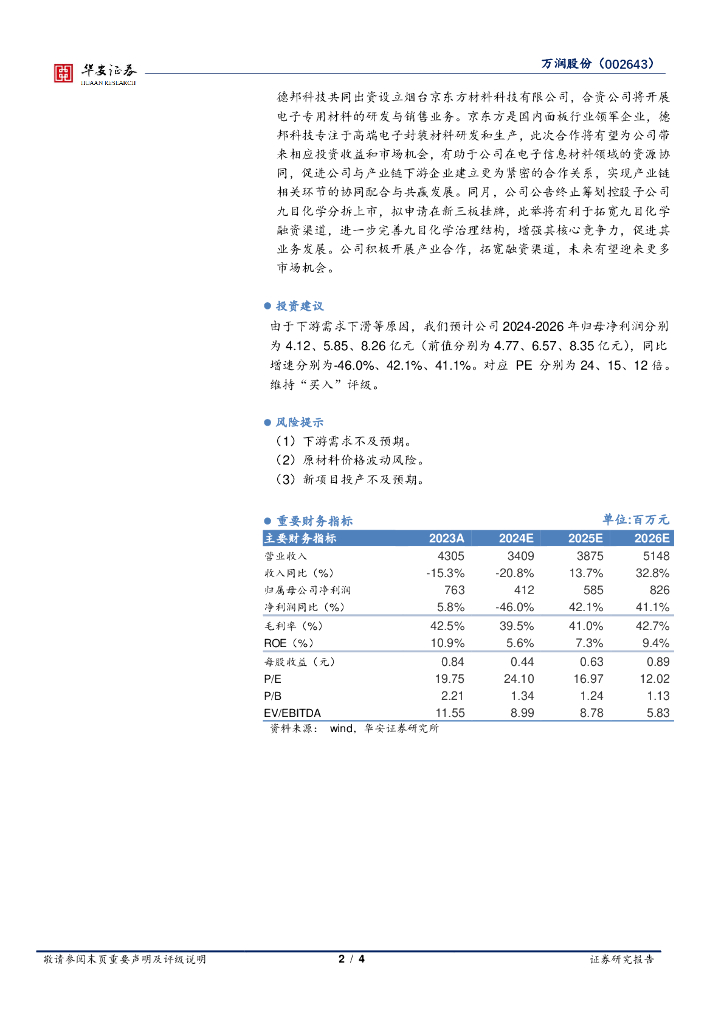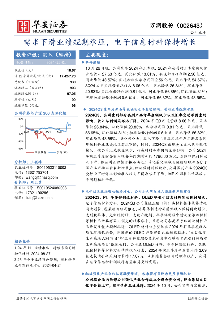 华安证券:万润股份(002643)-需求下滑业绩短期承压,电子信息材料保持增长.pdf