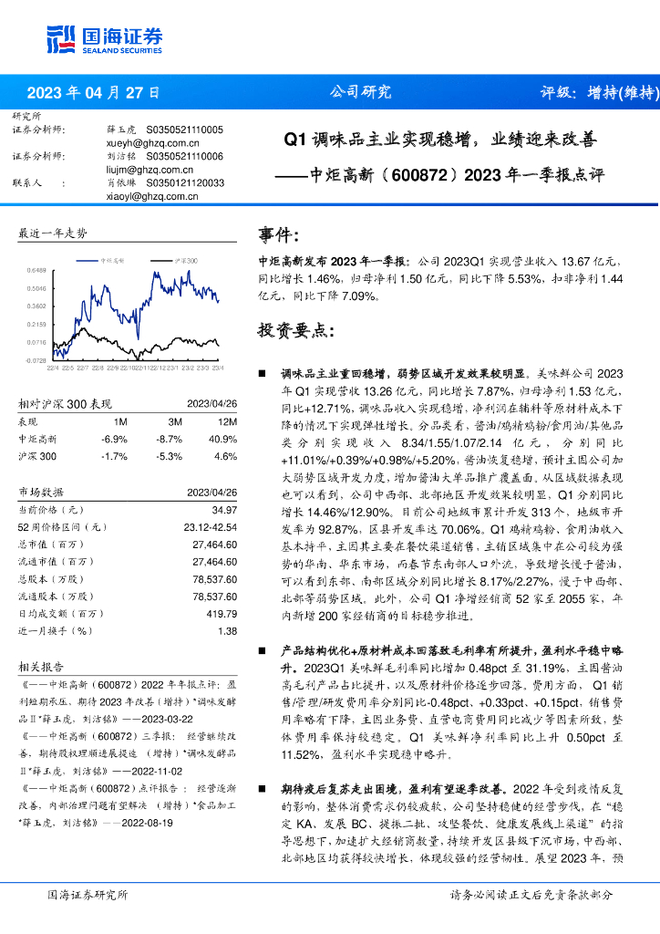 国海证券:中炬高新(600872)-2023年一季报点评:Q1调味品主业实现稳增,业绩迎来改善.pdf