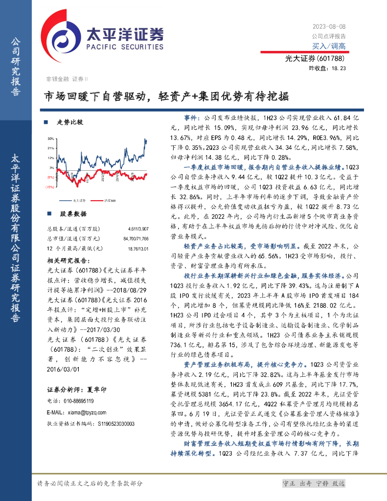太平洋证券:光大证券(601788)-市场回暖下自营驱动,轻资产+集团优势有待挖掘.pdf