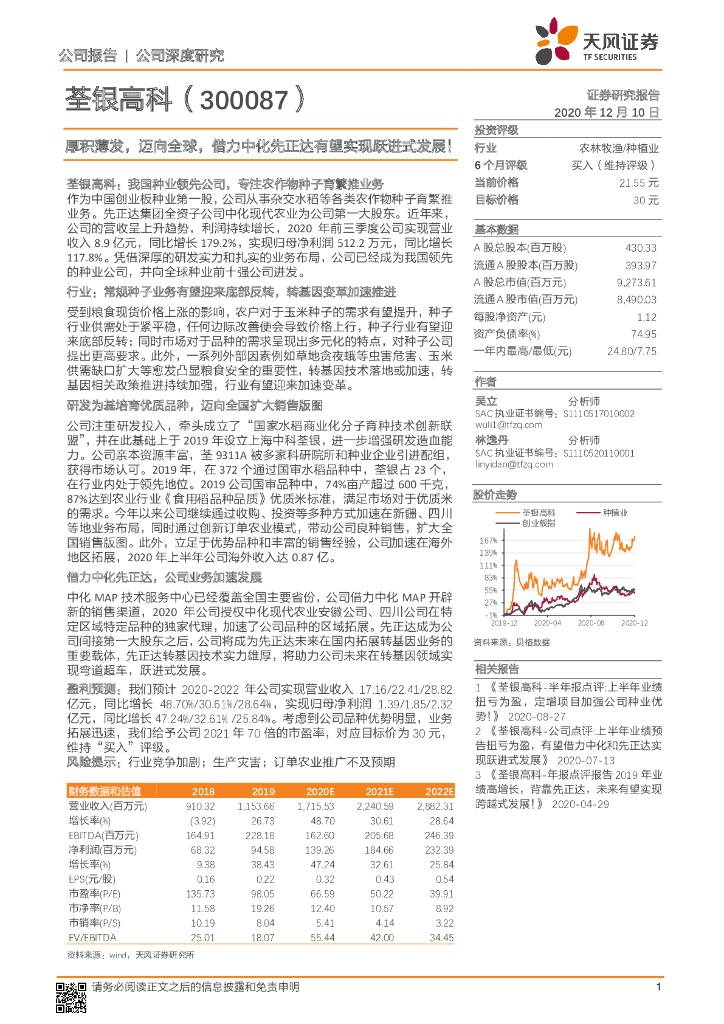 天风证券:荃银高科(300087)-厚积薄发,迈向全球,借力中化先正达有望实现跃进式发展!.pdf
