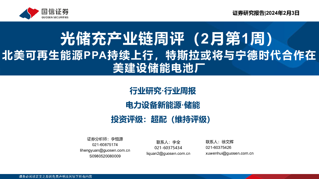 国信证券:光储充产业链周评(2月第1周):北美可再生能源PPA持续上行,特斯拉或将与宁德时代合作在美建设储能电池厂.pdf