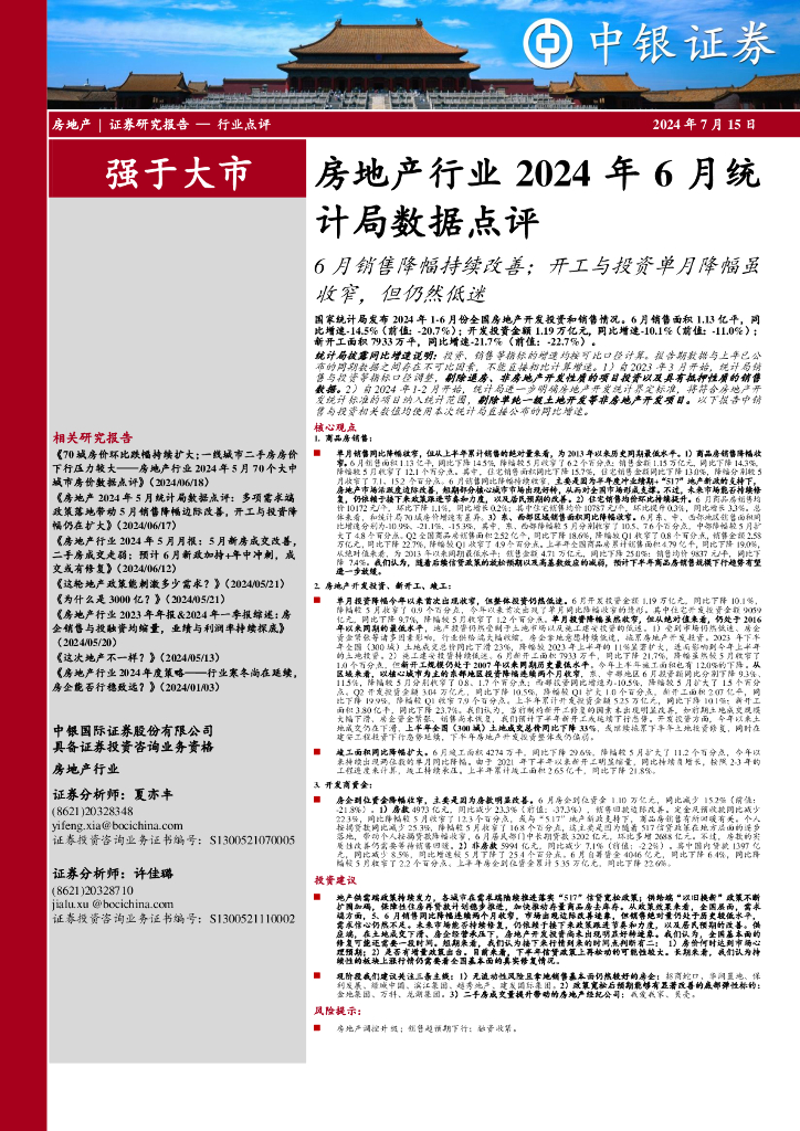 中银证券:房地产行业2024年6月统计局数据点评:6月销售降幅持续改善;开工与投资单月降幅虽收窄,但仍然低迷.pdf