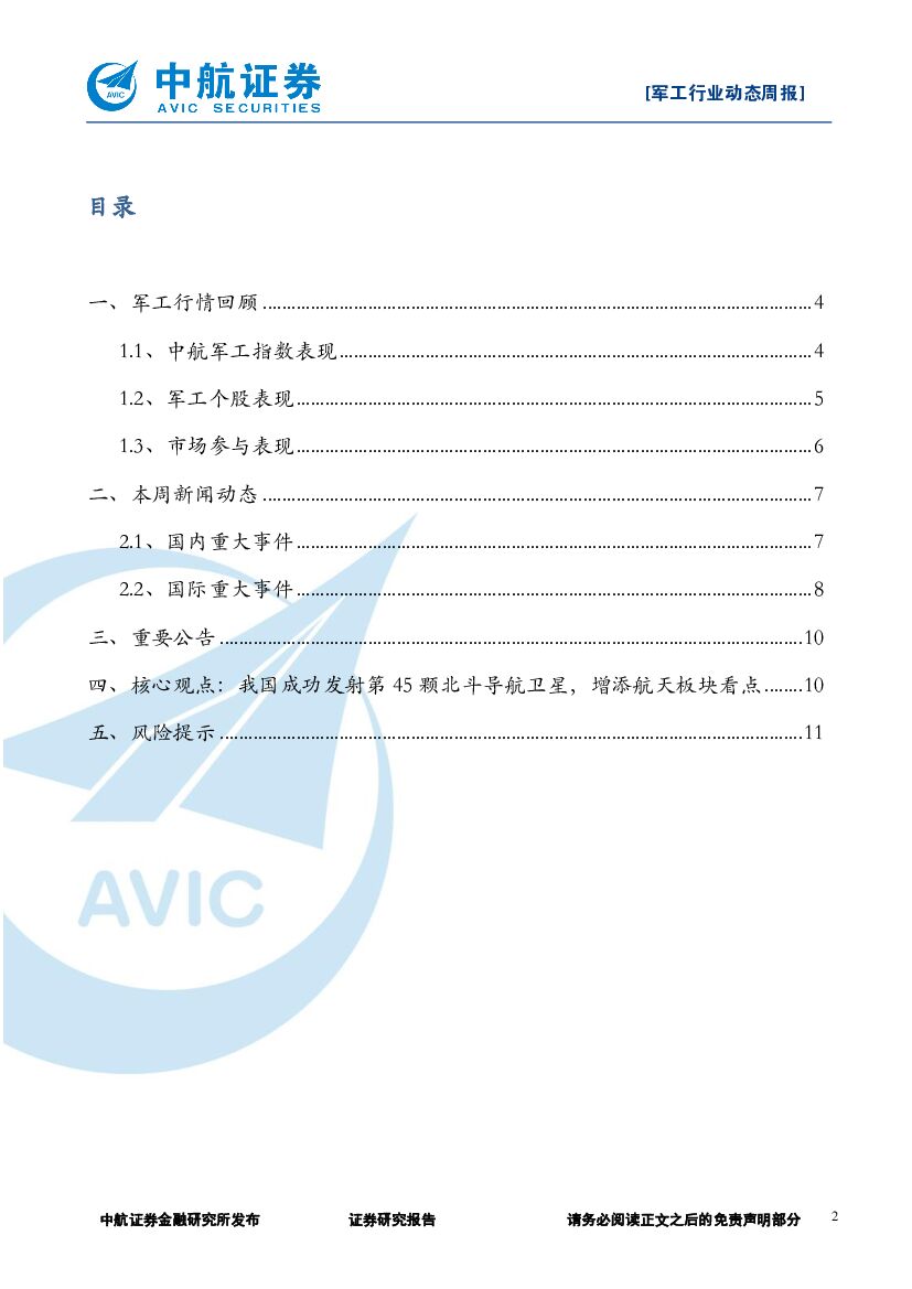 中航证券:军工行业动态周报:我国成功发射第45颗北斗导航卫星,加速我国高科技自主可控.pdf