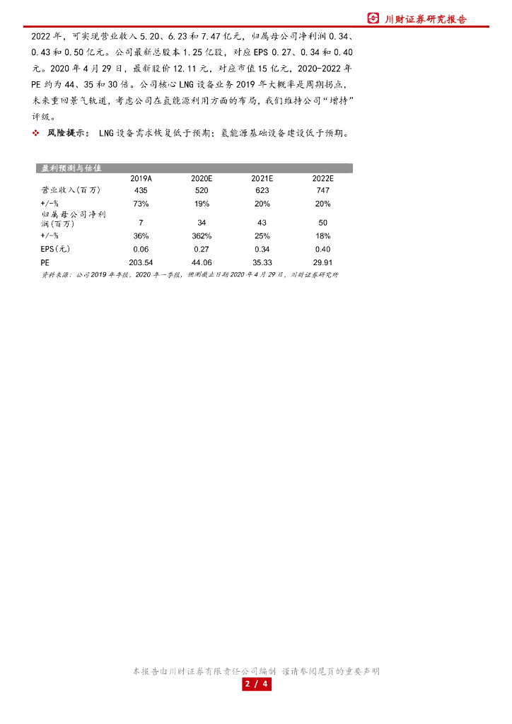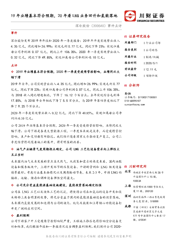 川财证券:深冷股份(300540)-19年业绩基本符合预期,20年看LNG业务回升和氢能落地.pdf