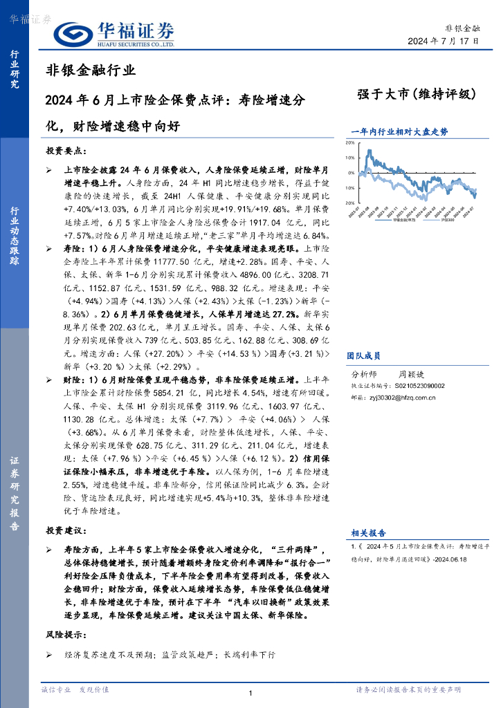 华福证券:2024年6月上市险企保费点评:寿险增速分化,财险增速稳中向好.pdf