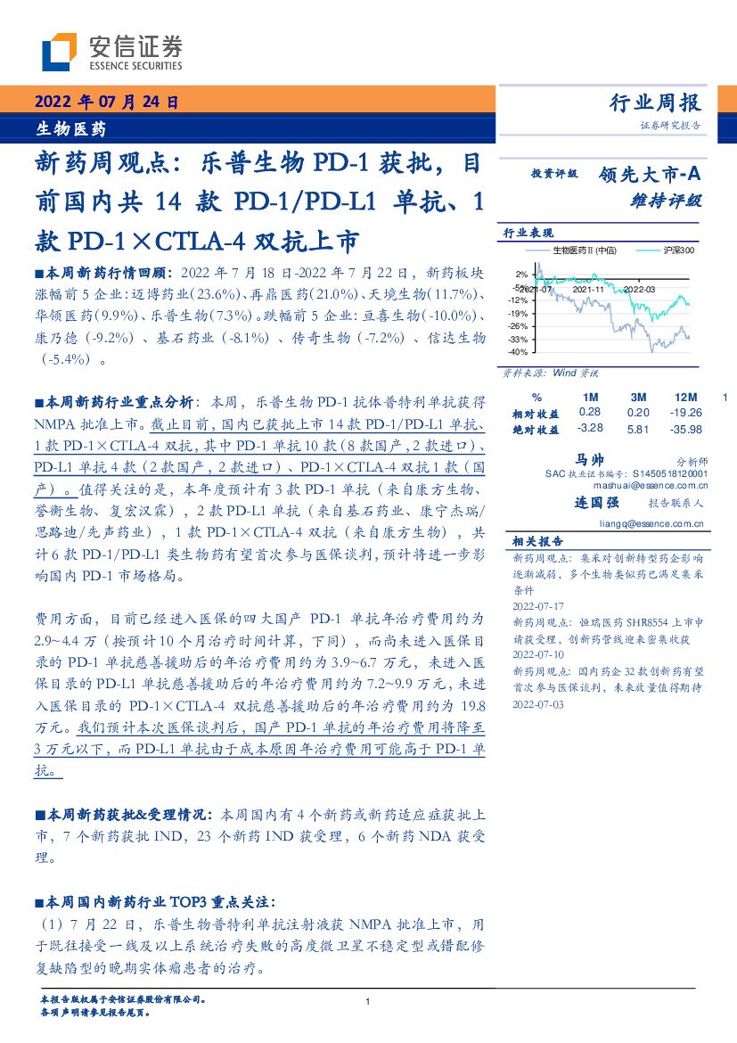 安信证券:新药周观点:乐普生物PD-1获批,目前国内共14款PD-1/PD-L1单抗、1款PD-1×CTLA-4双抗上市.pdf