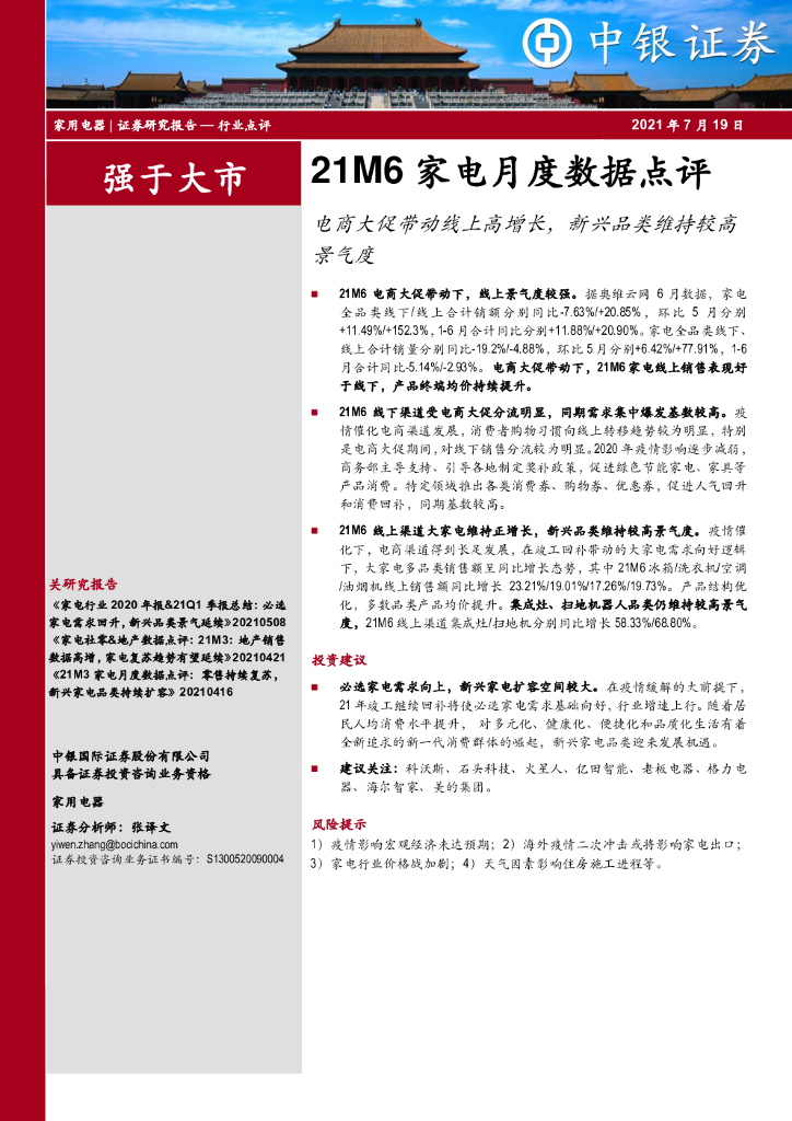 中银证券:21M6家电月度数据点评:电商大促带动线上高增长,新兴品类维持较高景气度.pdf