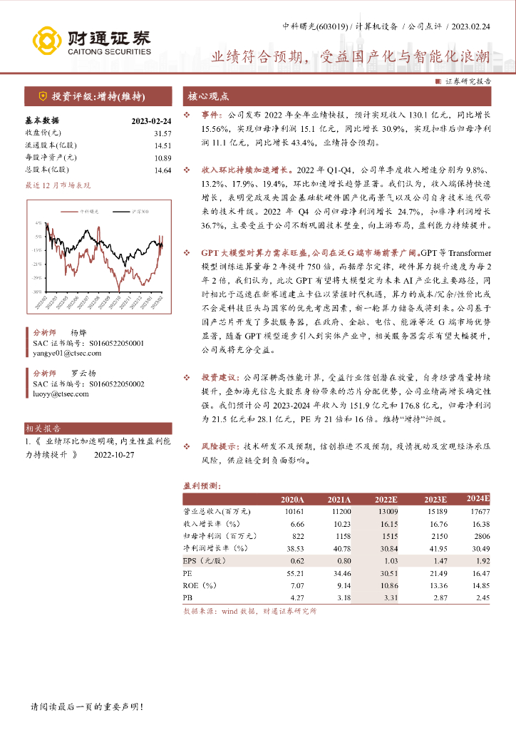 财通证券:中科曙光(603019)-业绩符合预期,受益国产化与智能化浪潮.pdf