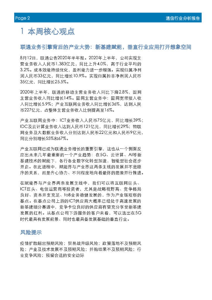 首创证券:通信行业周报:联通业务引擎背后的产业大势:新基建赋能,垂直行业应用打开想象空间.pdf
