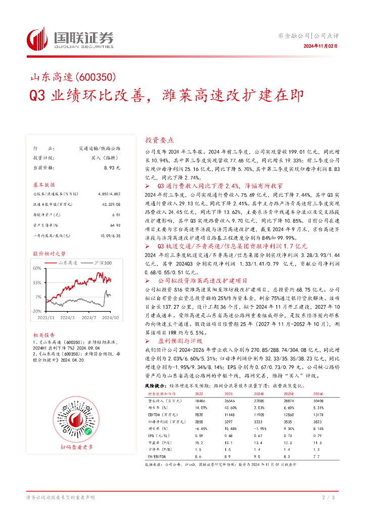 国联证券:山东高速(600350)-Q3业绩环比改善,潍莱高速改扩建在即.pdf