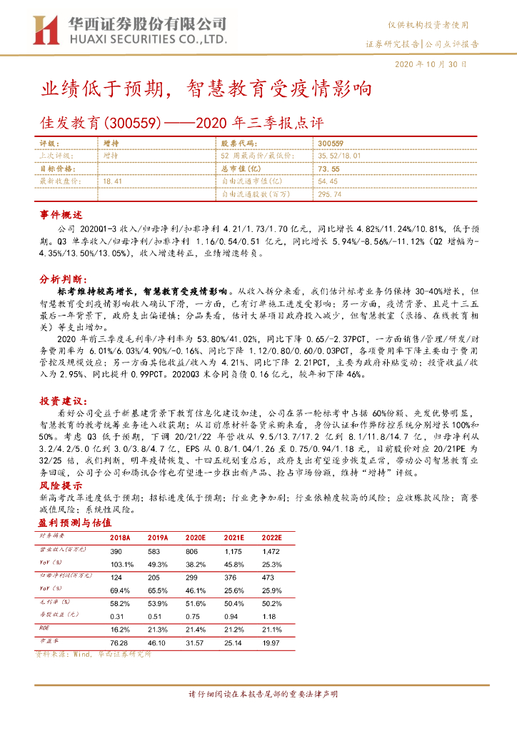 华西证券:佳发教育(300559)-2020年三季报点评:业绩低于预期,智慧教育受疫情影响.pdf