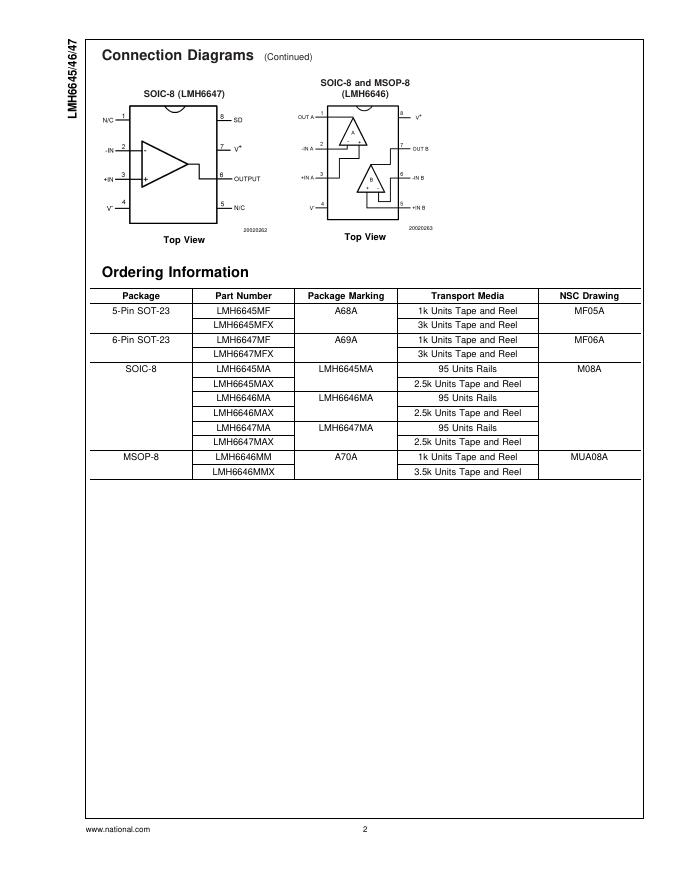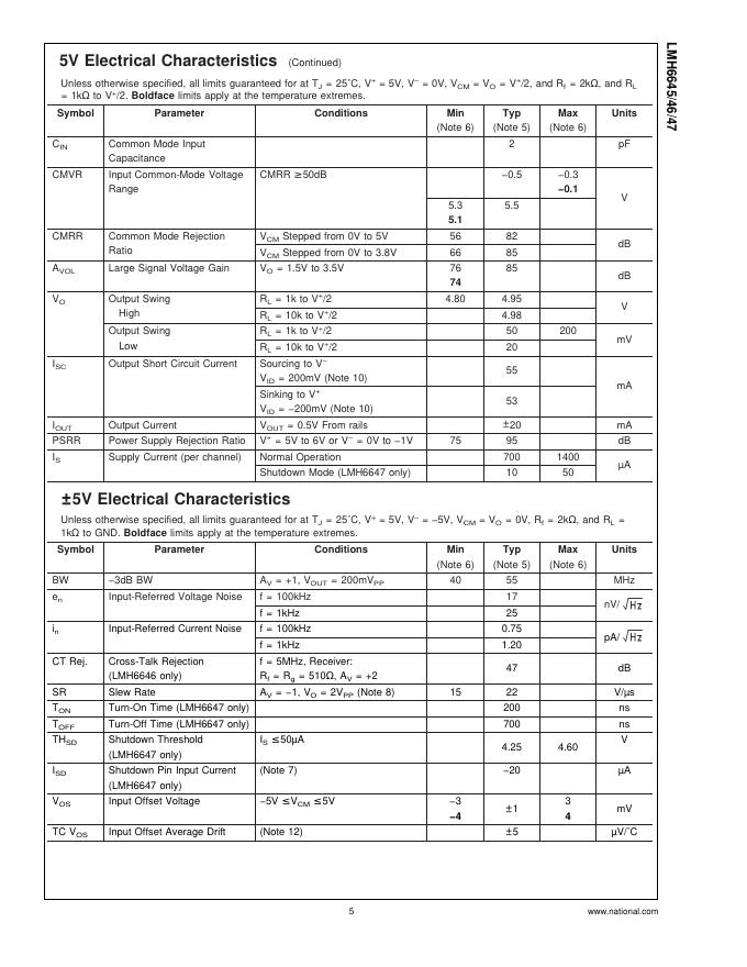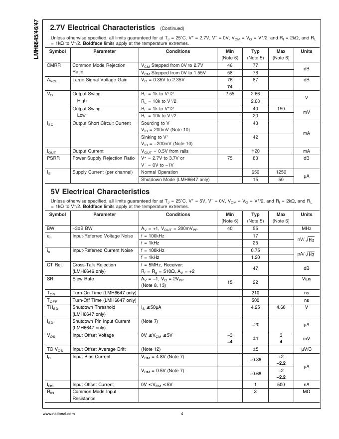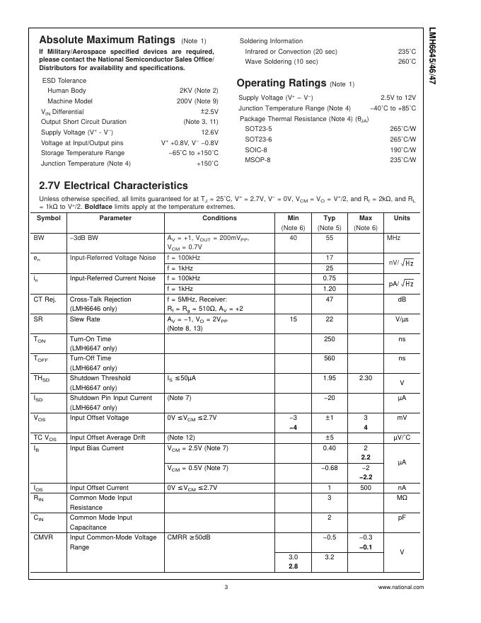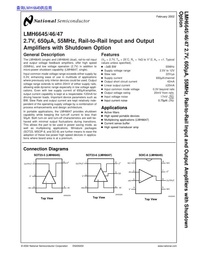 National Semiconductor LMH6645/46/47 2.7V, 650µA, 55MHz, Rail-to-Rail Input and Output Amplifiers with Shutdown Option 数据手册.pdf