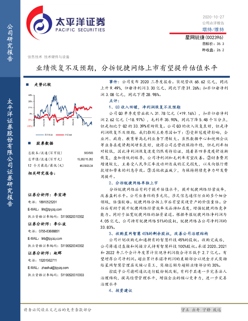 太平洋证券:星网锐捷(002396)-业绩恢复不及预期,分拆锐捷网络上市有望提升估值水平.pdf