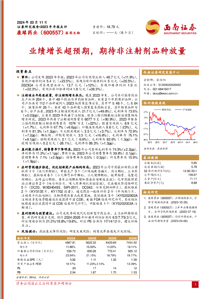 西南证券:康缘药业(600557)-业绩增长超预期,期待非注射剂品种放量.pdf