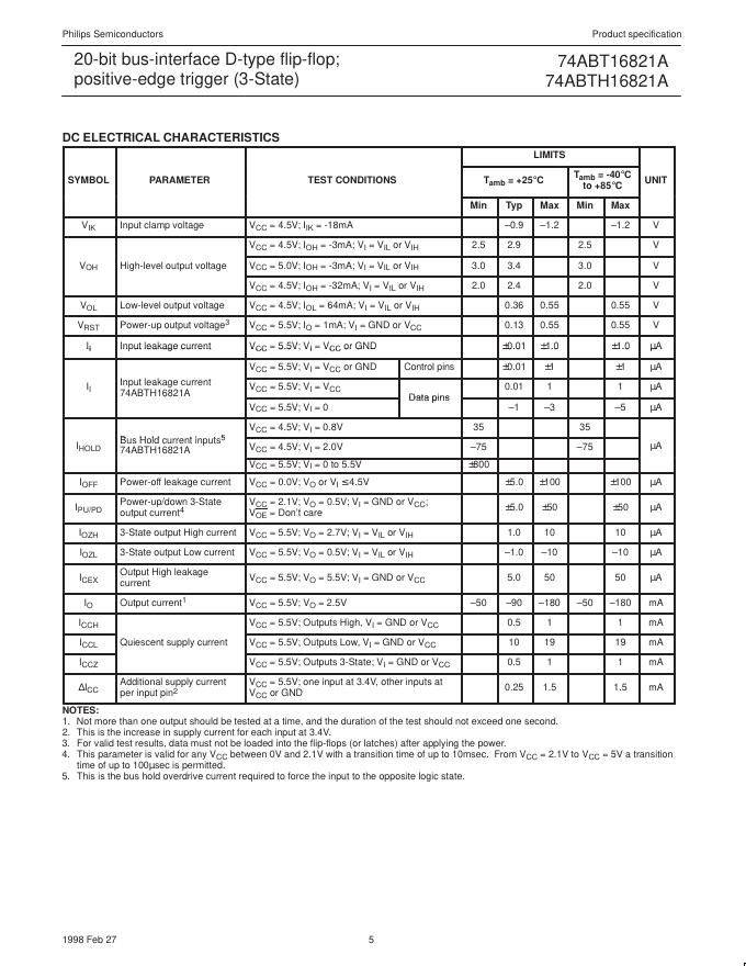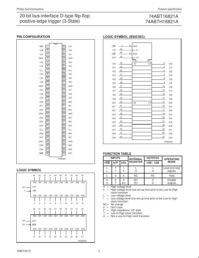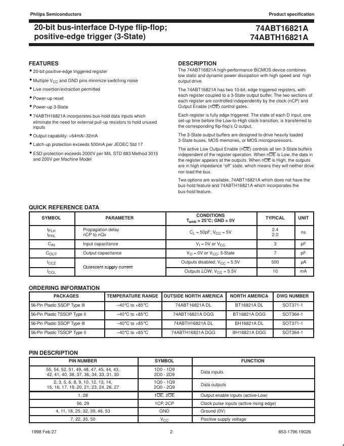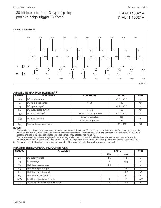 PHILIPS 74ABT16821A 74ABTH16821A 20-bit bus-interface D-type flip-flop; positive-edge trigger (3-State) 数据手册.pdf