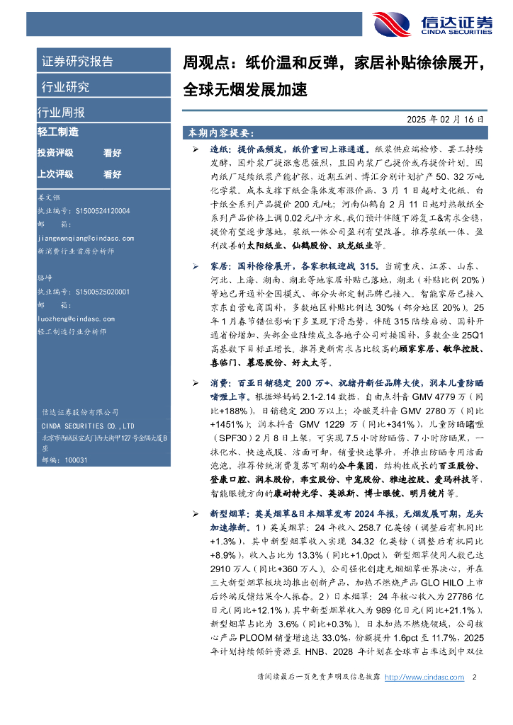 信达证券:轻工制造周观点:纸价温和反弹,家居补贴徐徐展开,全球无烟发展加速.pdf