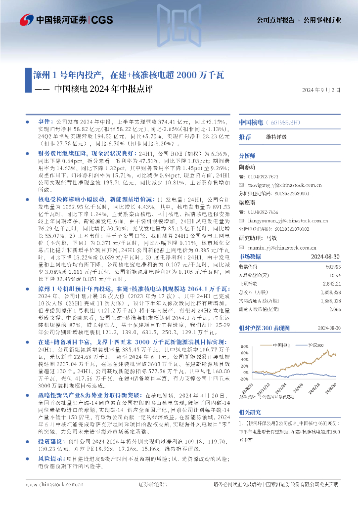 中国银河:中国核电2024年中报点评:漳州1号年内投产,在建+核准核电超2000万千瓦.pdf