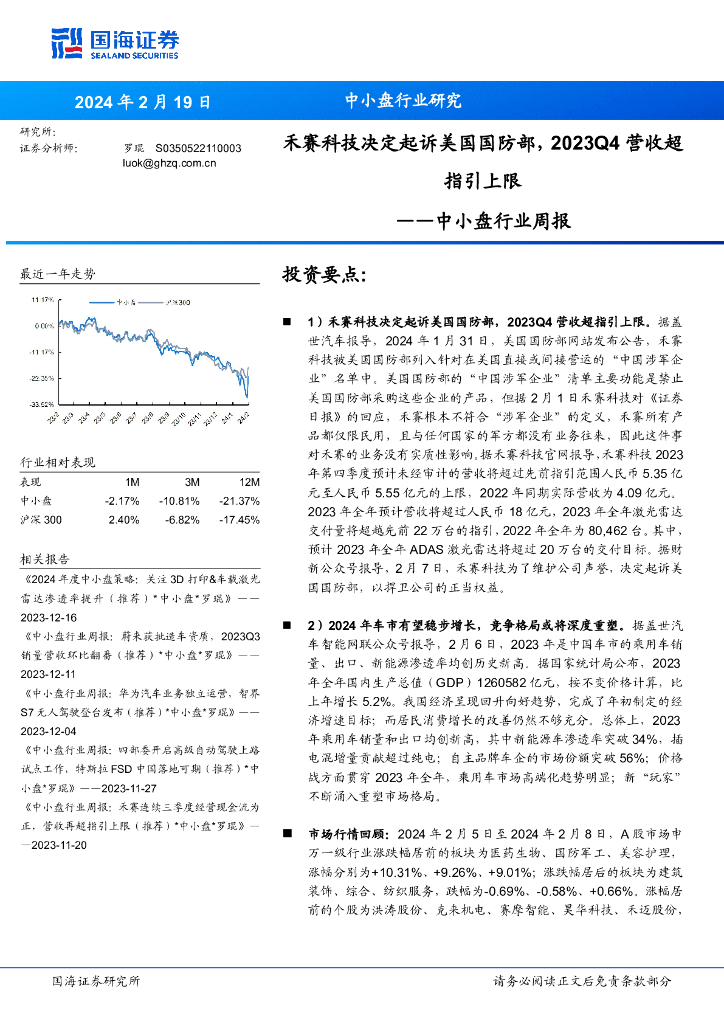 国海证券:中小盘行业周报:中小盘行业研究禾赛科技决定起诉美国国防部,2023Q4 营收超.pdf