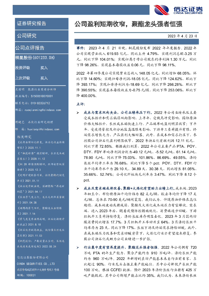 信达证券:桐昆股份(601233)-公司盈利短期收窄,聚酯龙头强者恒强.pdf