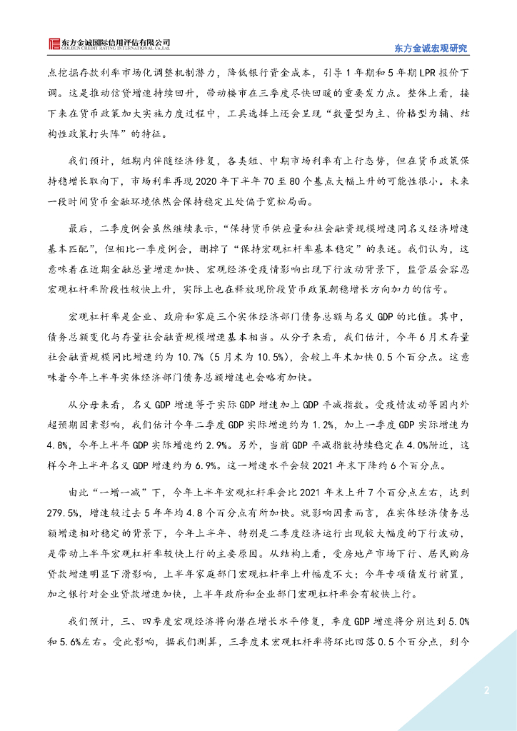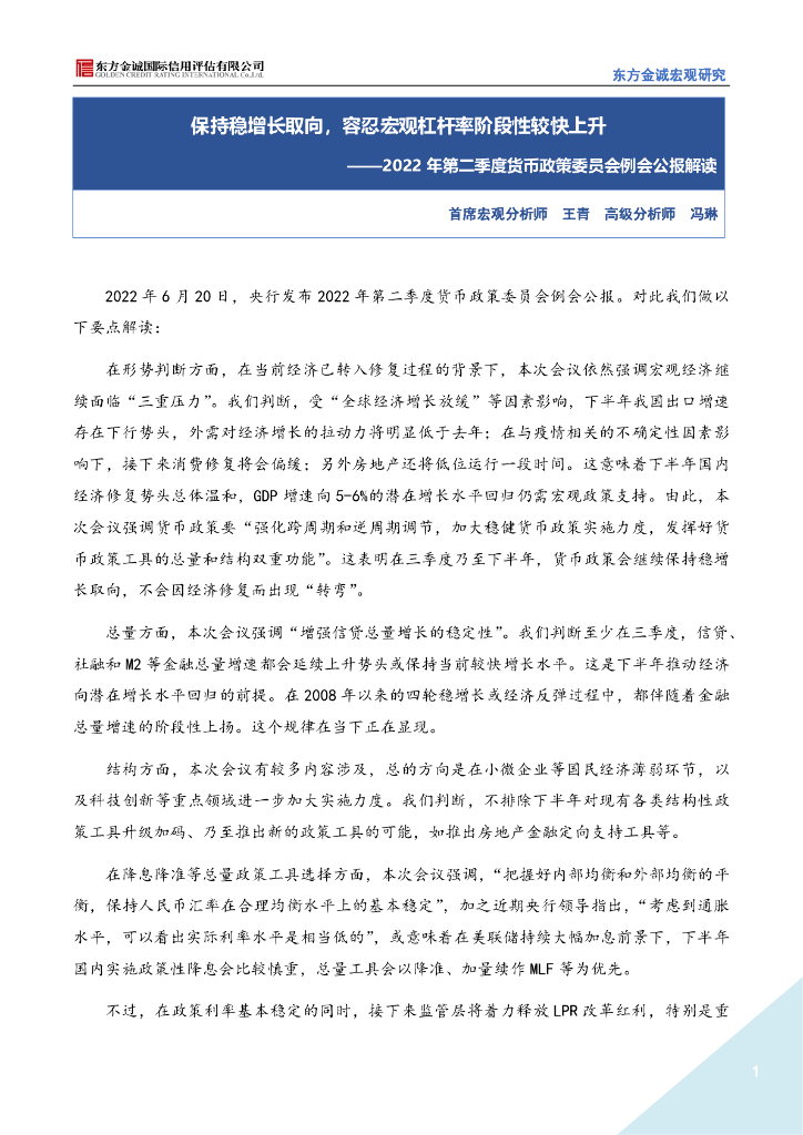 东方金诚:2022年第二季度货币政策委员会例会公报解读-保持稳增长取向,容忍宏观杠杆率阶段性较快上升.pdf