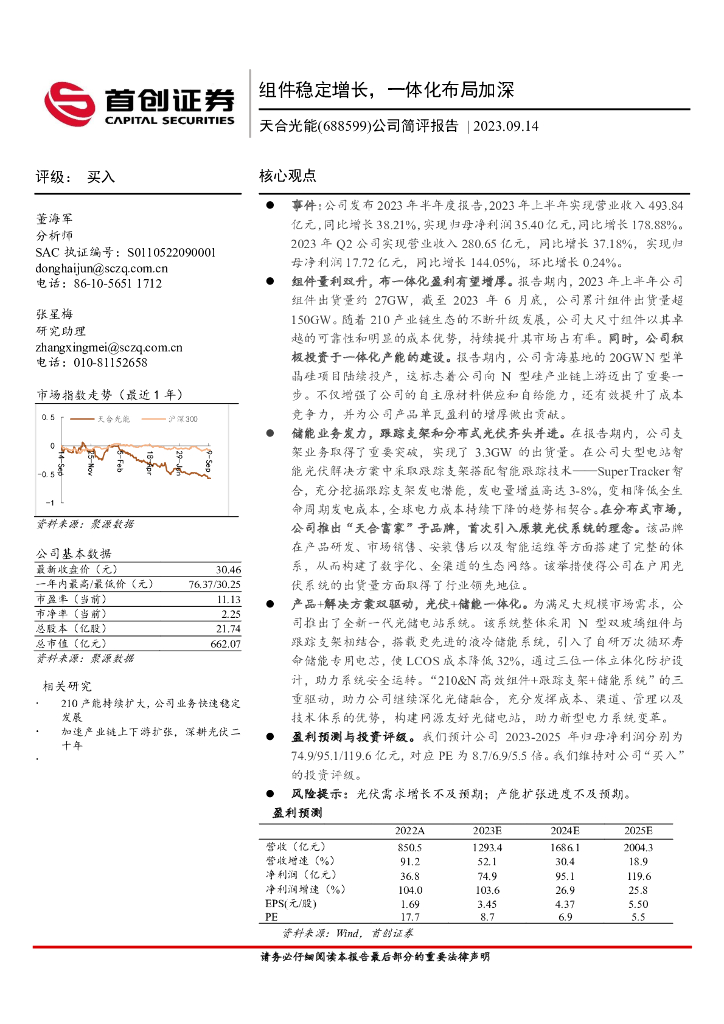 首创证券:天合光能(688599)-公司简评报告:组件稳定增长,一体化布局加深.pdf