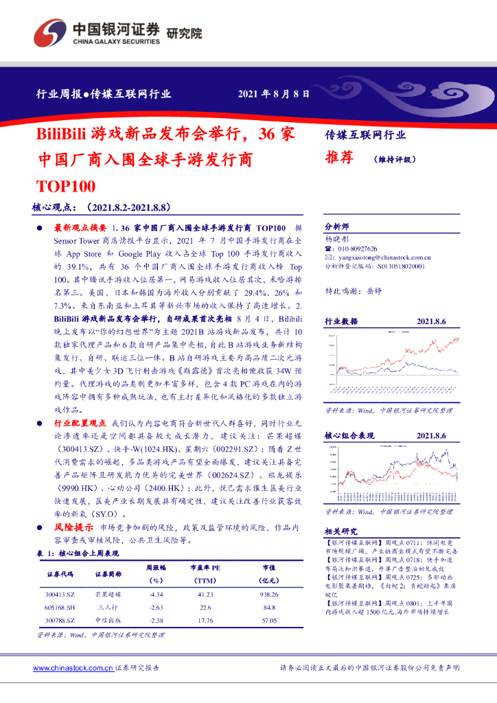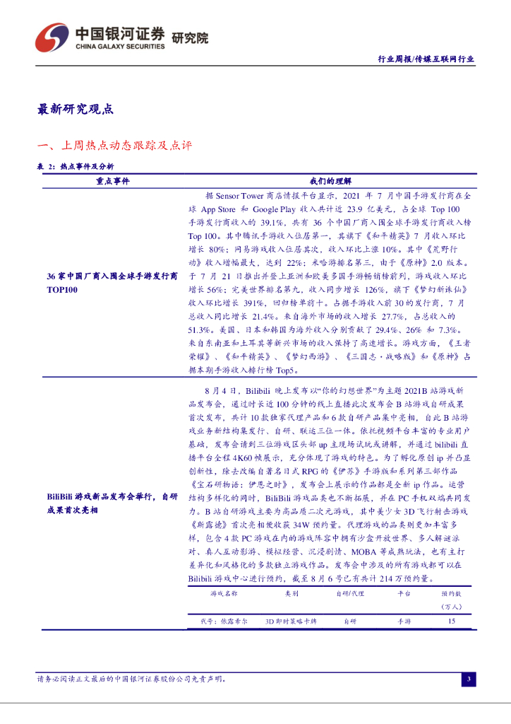 中国银河:传媒互联网行业:BiliBili游戏新品发布会举行,36家中国厂商入围全球手游发行商TOP100.pdf
