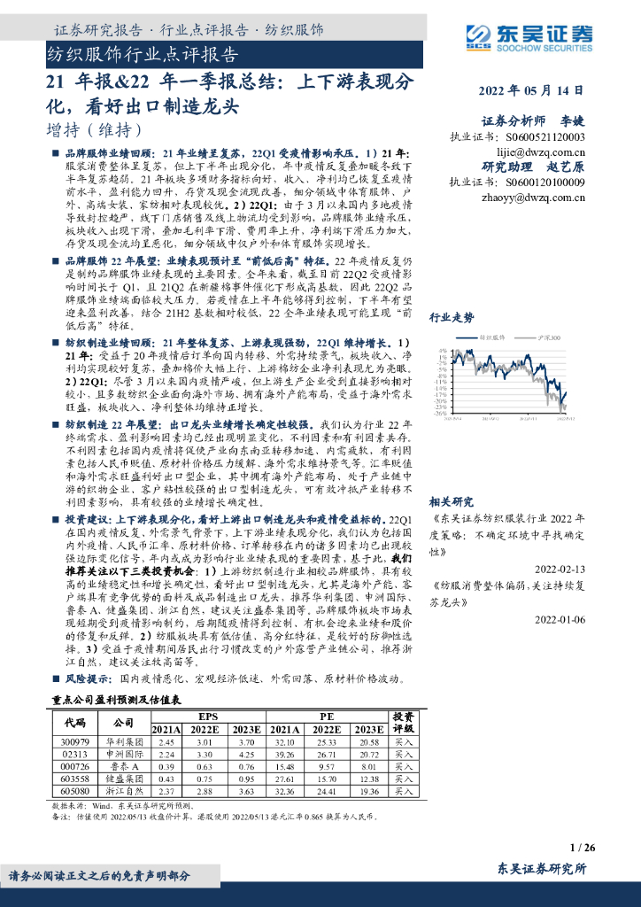 东吴证券:纺织服饰行业点评报告:21年报&22年一季报总结:上下游表现分化,看好出口制造龙头.pdf