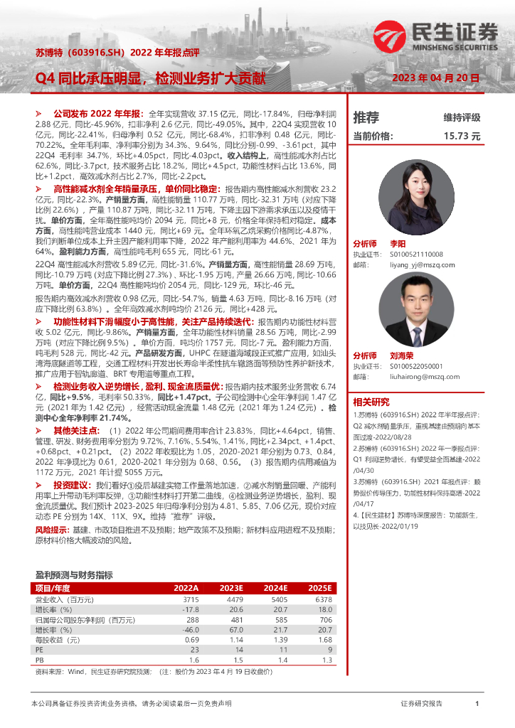 民生证券:苏博特(603916)-2022年年报点评:Q4同比承压明显,检测业务扩大贡献.pdf