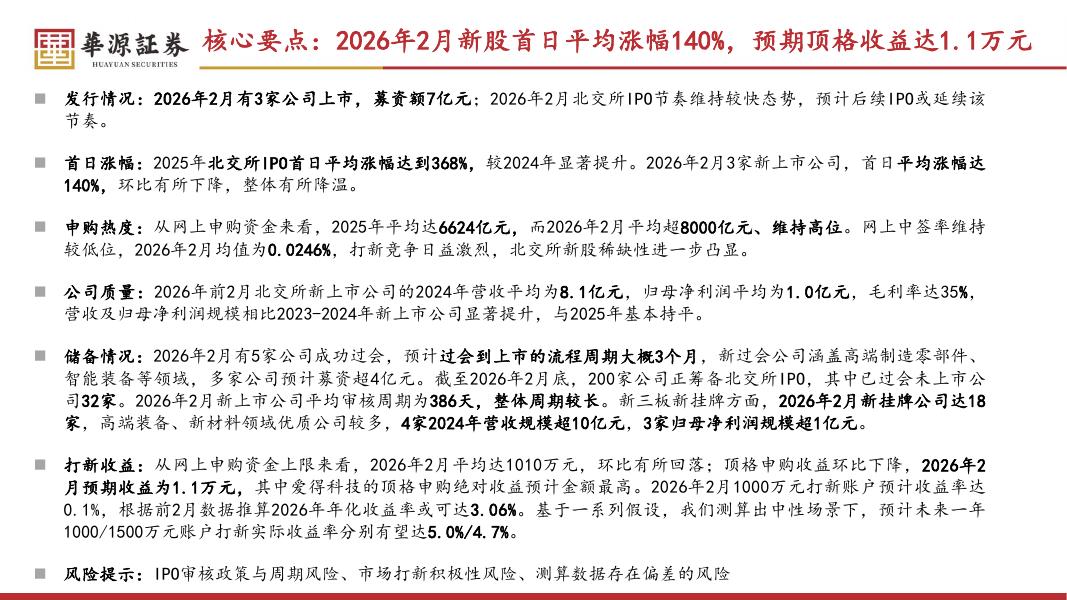 华源证券:北交所新股月度巡礼(2026年2月):2月新股首日涨幅均值140%,网上申购资金平均超8000亿元-260302.pdf
